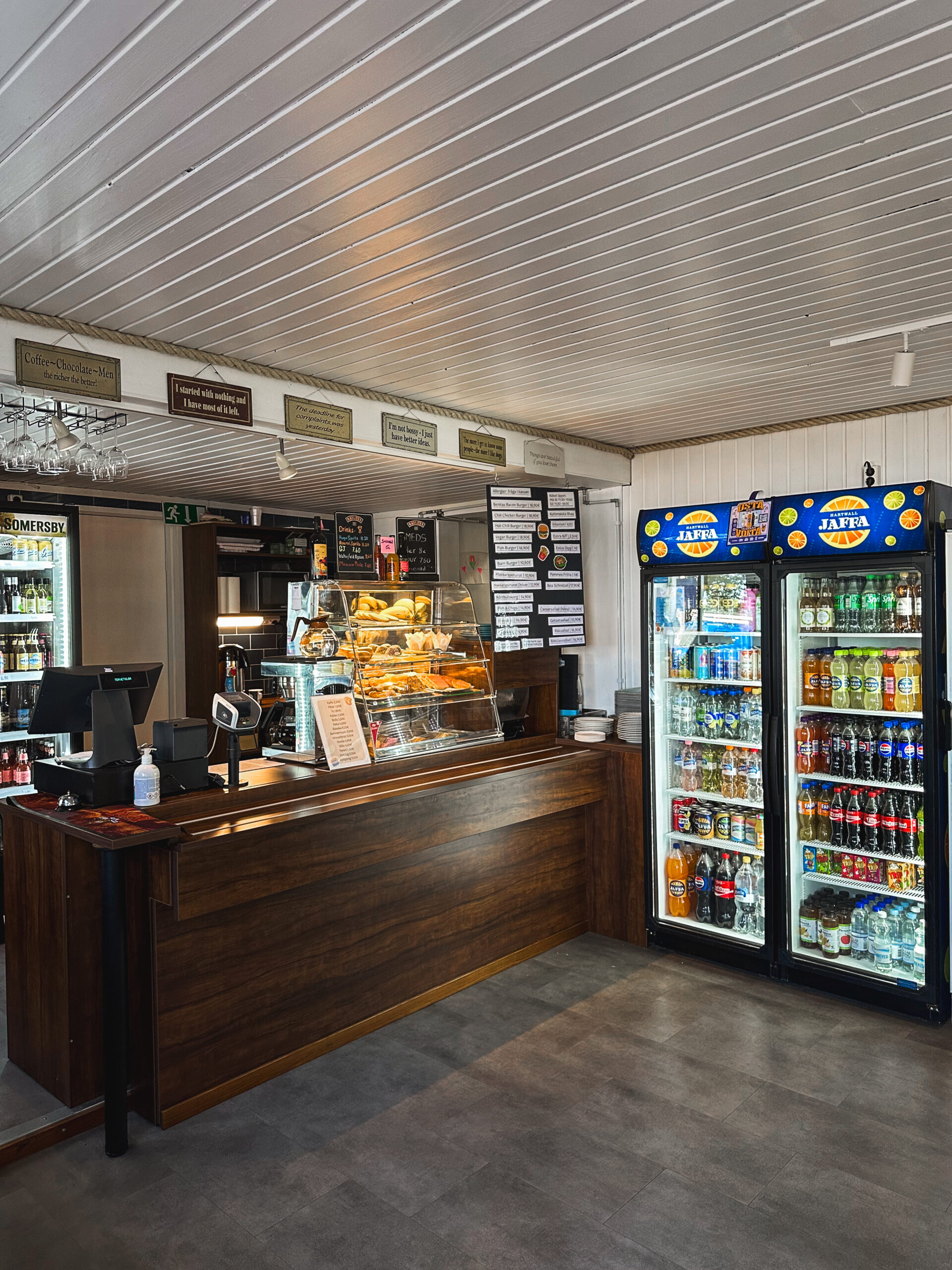 Hos oss hittar du både söta och salta tilltugg till kaffet. Är du hungrigare kan du beställa mat från köket – allt från hamburgare till fräscha sallader. På vår trivsamma terrass kan du koppla av med en drink och njuta av skärgårdsluften. Observera att utskänkning endast sker på terrassen. I caféet finns även en liten butik med de vanligaste livsmedlen för stug- och båtfolk.